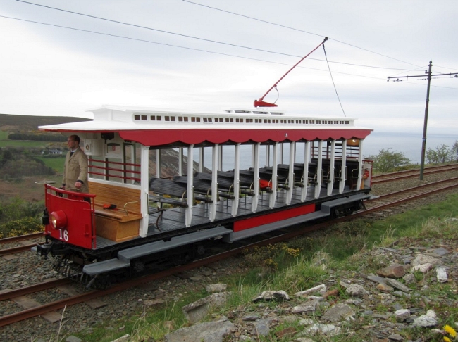 Car No.16 pauses for a photo-stop at Bulgham Head, working the 12:40 Laxey to Dhoon Quarry special on the 14th of April 2017. © Josh Haworth