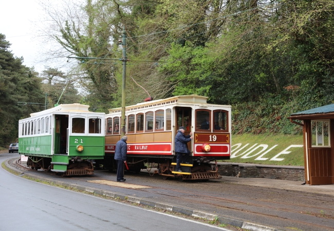 Single line working is in place between Onchan Head and Groudle on this view from the 14th of April 2017 – The motorman of Car No.21 has just received the single line staff and will proceed south once Car No.19 and Trailer No.47 have headed north with the 13:40 to Ramsey. © Colin Clifton