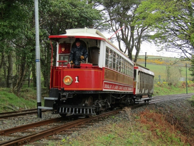 Car No.1 and Trailer No.47 arrive at Dhoon Glen with the 10:10 Ramsey to Derby Castle on the 16th of April 2017, in less than favourable weather. © Josh Haworth