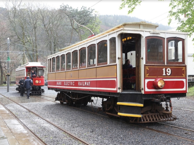 Car No.19 and Car No.2 wait at Laxey Station to depart with northbound workings, Car No.2 the late running 14:25 to Ramsey, and Car No.19 the 14:55 to Ramsey. © Colin Clifton