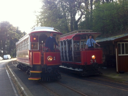 Car No.1 and Car No.33/Van No.4 after the completion of the parallel run, pausing for a photograph at Groudle Glen. © Alex Fairlie