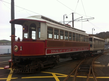 The red and blue combination of Car No.1 and Trailer No.48 wait to leave Derby Castle Car Shed northbound. © Alex Fairlie