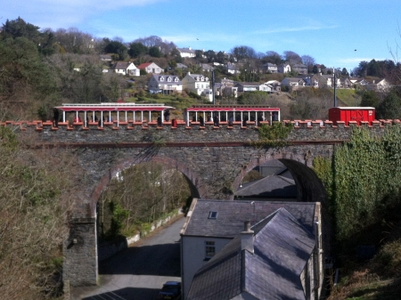 Car No.32 crosses Laxey Viaduct with Trailer No.43, Wagon No.8 and Van No.4 in tow. © Alex Fairlie