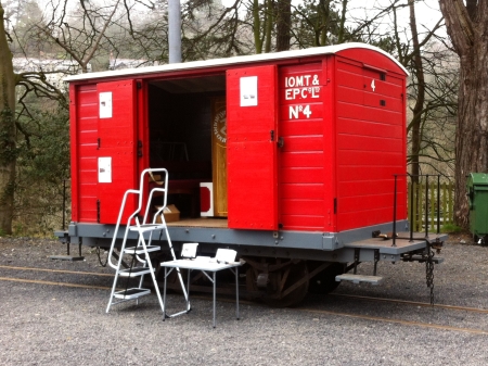 Van No.4 stabled in the Refreshment Siding at Laxey, selling limited edition stamp covers. © Alex Fairlie