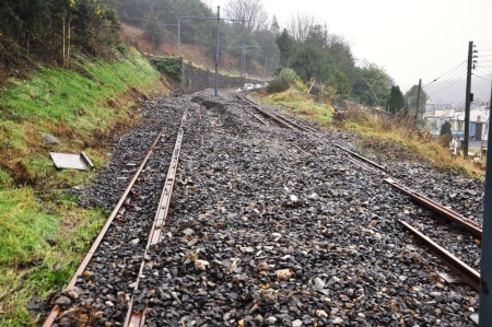 Another recent spell of heavy rain on 21st January caused further run offs and movement of ballast on the Snaefell Mountain Railway to the rear of Browns Cafe. © Andrew Scarffe