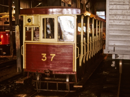 Trailer No.37 received a maroon livery during 1978/79 to run with Car No.9 during the 1979 ‘Centenary of Electric Traction’ celebrations, pictured here inside Derby Castle Top Sheds during August 1991. © http://www.mer.im