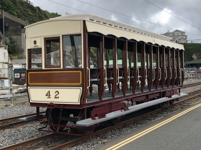 During 2020/21 Trailer No.42 received a repaint into its original livery of Ivory and Teak. It debuted in its new livery behind Car No.2 at the ‘Mini Manx Heritage Transport Festival’, held in August 2021. Here the trailer waits next to the former Summerland site, waiting for Car No.2 to shunt it back to the departure stop. © Alex Fairlie