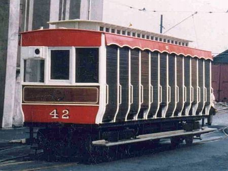 Trailer No.42 at Ramsey in the 1970s, with basic Red/White/Teak livery with M.E.R Crest, but no lettering. © Steve Kemp