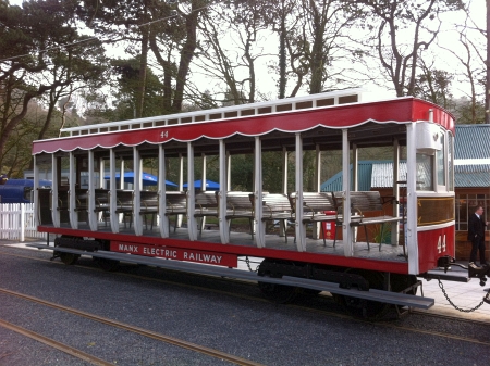 Trailer No.44 awaits departure from Laxey southbound in April 2015, shortly after repainting. © Alex Fairlie