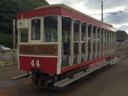 Trailer No.44 waits for its motor to run-round at Derby Castle in July 2016. Note the addition of the M.E.R crest on the middle panel. © Alex Fairlie