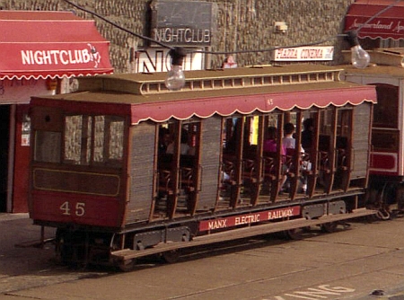Trailer No.45 was then repainted in a M.E.R Red and Teak scheme, seen here passing Summerland behind ‘Winter Saloon’ No.22 in September 1990. © Charlie Verrall
