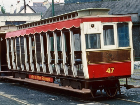 Now with yellow numbering, Trailer No.47 awaits departure behind a ‘Winter Saloon’ at Ramsey during August 1982. © http://www.mer.im