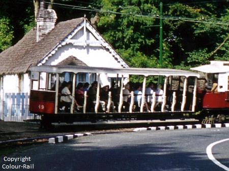 Trailer No.49 leaving Groudle Glen northbound behind Car No.2 on the 25th of July 1968, carrying M.E.R Red/White/Teak. © Colour-Rail