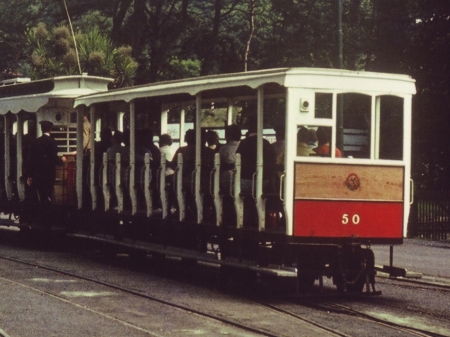 Trailer No.50 awaiting departure at Laxey, in it’s last M.E.R Repaint of Red/Teak/White. © Travel Lens Photographic