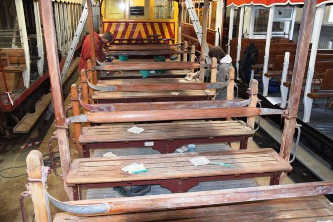 Varnishing work underway on the seats and supports of Trailer No.51. © Andrew Scarffe