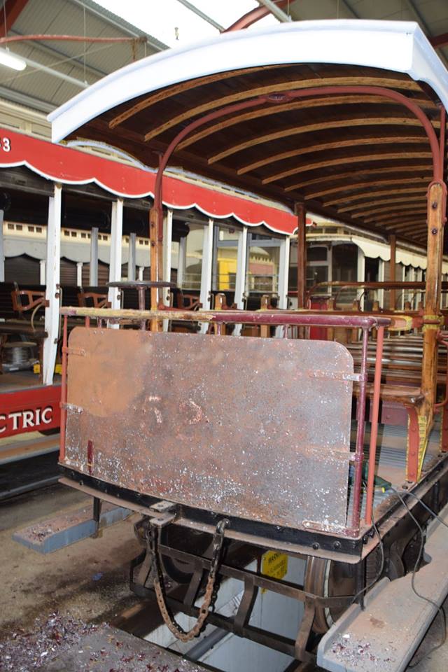 Another volunteer work session on trailer 51 today. Paint was removed from the dash panel to reveal the number 52! This must have been 52’s Ramsey end dash panel which re-used when trailer 51 was converted back to an “umbrella” in 1987. © Andrew Scarffe