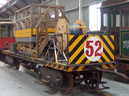 Trailer No.52 then received ‘wasp stripes’ on it’s end bulkhead, and was fitted with the scissor lift. It is pictured here inside Laxey Car Shed during September 2010. © David Martin