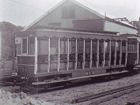 Trailer No.56 in the Laxey Blacksmiths Siding during the 1940s, wearing ‘M.E.R’ Austerity livery. © Travel Lens Photographic