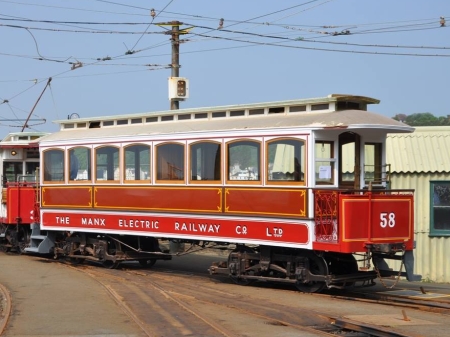 Trailer No.58 returned from overhaul following derailment damage in June 2016 for the TT Events, albeit on a temporary basis. Here the Trailer leaves Derby Castle Car Shed for service behind Car No.32. Remaining work to complete at this stage included further paintwork lining out and lampbox/roof window refitment. © Andrew Scarffe