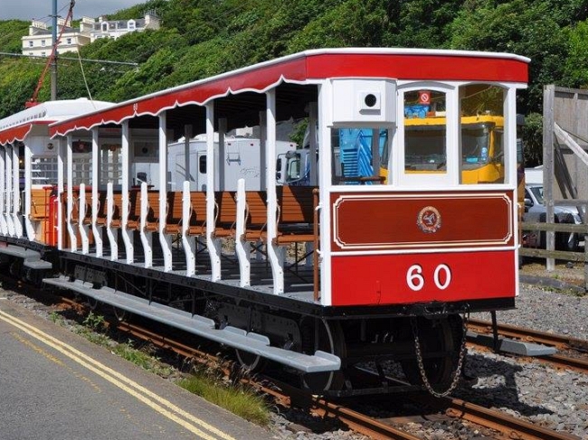 During Winter 2016/17 No.60 received a coat of the standard M.E.R red and white fleet livery, after 17 years carrying green. The Trailer is seen here at Derby Castle behind Car No.16 on the 4th of June 2017, its first day in traffic following repaint. © Andrew Scarffe