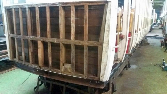 Bodywork renewal underway on Trailer No.46 on February 8th 2017. © Manx Electric Railway Museum