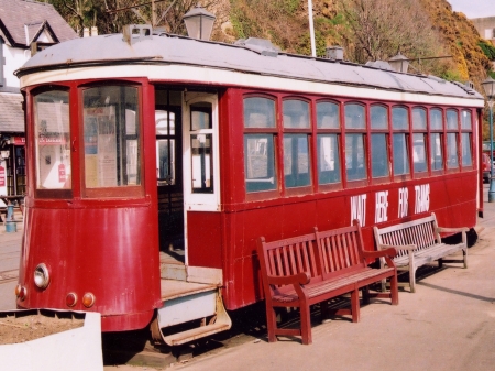 Shortly after arrival at Derby Castle’s Groudle Siding, No.360 was de-trucked and then rested on wooden blocks. It was painted into an all over maroon livery with ‘Wait Here for Trams’ on the side. Pictured here shortly before removal from Derby Castle, in April 2002. © David Beardmore