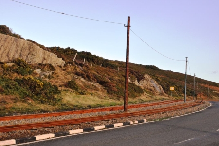 Continuing work on the renewal of the overhead wire and fittings between Howstrake and Onchan Head. At Lag Birragh, the bracket arms have been removed from the poles presenting this unusual sight. © Andrew Scarffe