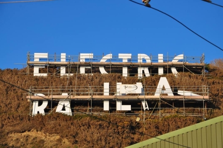 Progress on the installation of the new Electric Railway sign above Derby Castle yard. © Andrew Scarffe