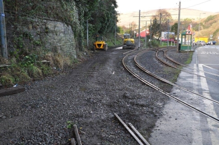 Work has also commenced on the relaying of the single track of the Snaefell line on the uphill side of the main level crossing at Laxey. © Andrew Scarffe