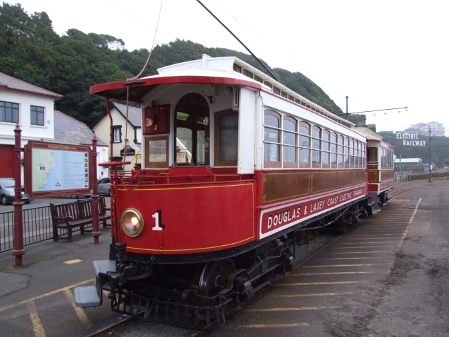 Car No.1 and Trailer No.59 wait to return to depot at Derby Castle after working a private hire for the Isle of Man 50 Group on the 24th of July 2012. The pole has been spun round on Car No.1, and it will propel the Trailer back up to the Car Sheds. © Alex Fairlie