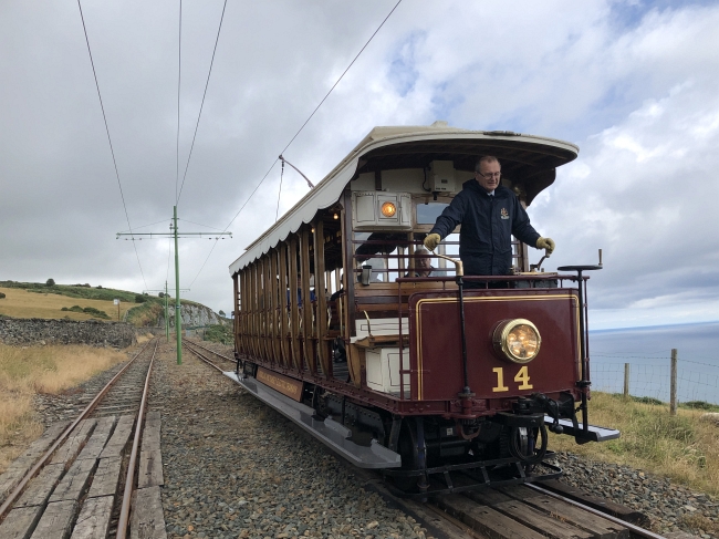 Car No.14 departs Ballaragh with the 11:03 Lewaigue to Laxey, running as part of the 2021 Mini Manx Heritage Transport Festival’s intensive service day. © Alex Fairlie