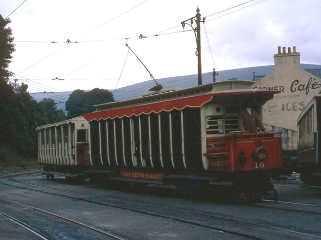 Car No.16 passes Laxey Goods Shed with Trailer No.53 in tow on the 29th of July 1969. Working as a special from Ramsey, it was clearly an inclement trip on the northern section – The trailer is empty, and all shutters are nearly down on the Car! © Lindsay Bridge