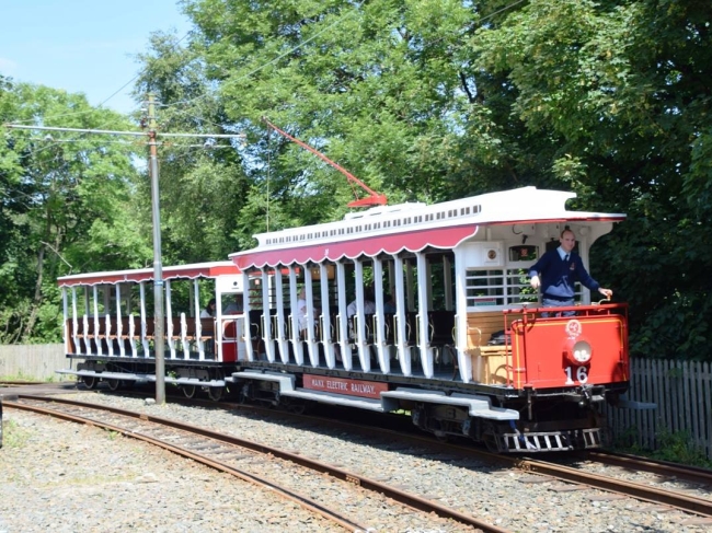 Car No.16 and Trailer No.60 pass the Laxey 1894 station site (today’s car shed stop) with the 1110 Ramsey to Derby Castle on the 19th of June 2017. © Andrew Scarffe