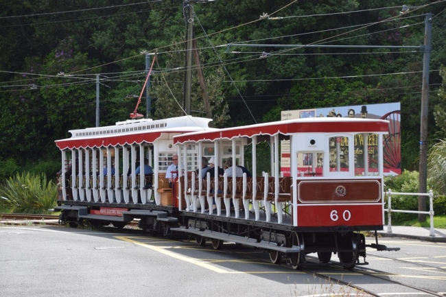 Trailer No.60 and Car No.16 pass over the Laxey No.2 Road Crossing at Dumbell’s Row on the 19th of June 2017, with a working from Ramsey to Derby Castle. © Andrew Scarffe