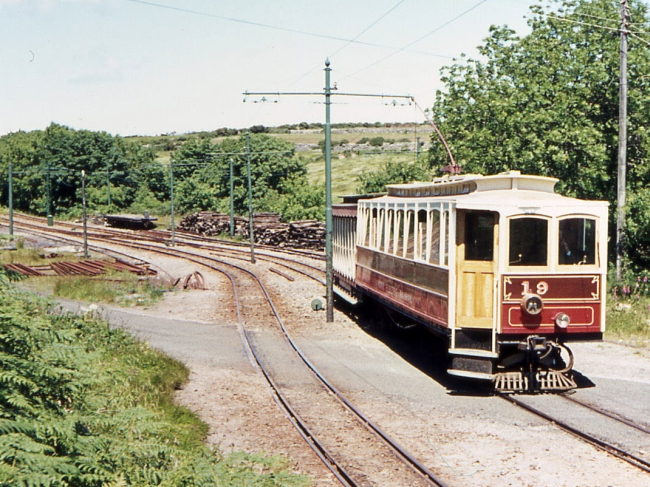 Car No.19 and Trailer No.40 pass the stop and road crossing at Dhoon Quarry with the 13:45 Ramsey to Derby Castle on the 7th of July 1973. Note Wagon No.21 in the background, stabled on the stub of the former loading siding’s headshunt. © Richard Pryke