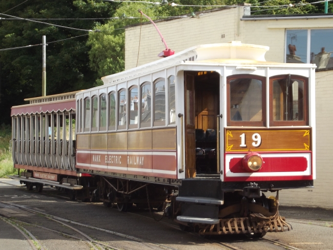 Car No.19 and Trailer No.40 have unloaded their passengers at Ramsey and wait to run-round on the 7th of August 2012. Car No.19 had just been freshly painted out of the ‘austerity’ scheme it had carried since 2002 – although it was only to look like this for one season, before the application of Santa Tram vinyls. These were then followed by ‘120 Years of the MER’ vinyls in the Spring of 2013, applied over the middle front panel. © Josh Haworth