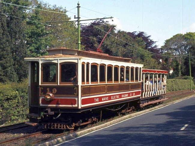 Car No.19 heads downgrade to Eskadale with Trailer No.60 in tow on the 10:15 Laxey to Derby Castle on the 28th of May 1984. This unusual combination was required to get Trailer No.60 back to Derby Castle after a working earlier in the day. © Richard Lomas
