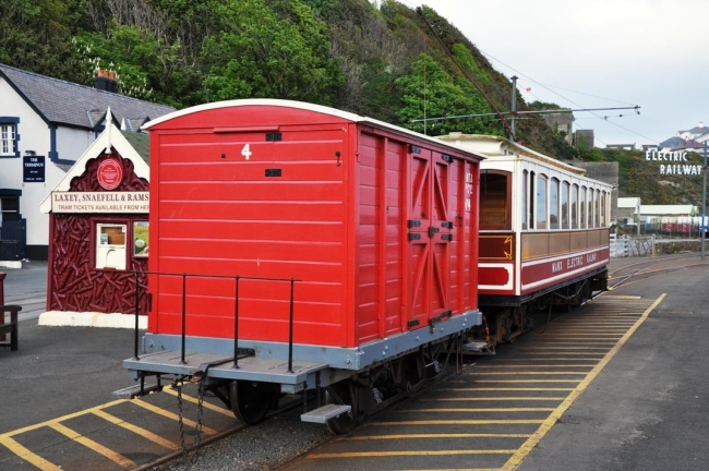 Car No.19 and Van No.4 standing at Derby Castle on the 6th of May 2017. No.19 was operating a special journey in conjunction with the ‘Indian Hill’ dining event on Snaefell Summit, and was used to take Van No.4 back to Laxey Car Shed for storage. © Andrew Scarffe