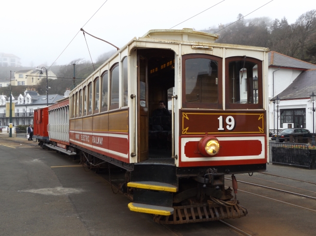 Car No.19 waits to shunt onto the departure stop with Trailer No.40 and Van No.4, to work a service to Laxey on the 5th of April 2015. Van No.4 was to be in use at Laxey for selling special stamp covers, as part of the 2015 Rush Hour Event. © Josh Haworth
