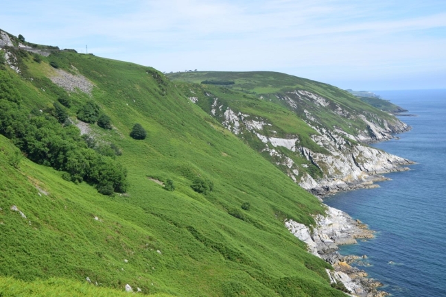 Dwarfed by the magnificent coastal scenery, Car No.2 and Trailer No.48 descend from summit corner, 588 feet above sea level, around Bulgham Bay, working the 11.10 from Ramsey on the 20th of June 2017; the pair can just be seen in the top left of the picture. © Andrew Scarffe