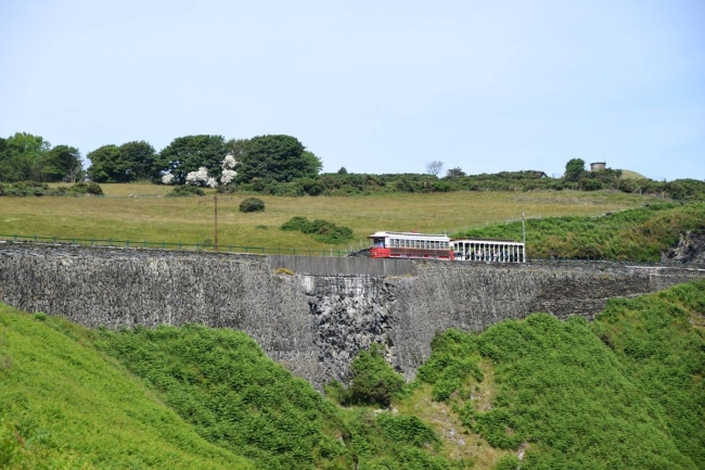 Dwarfed by the magnificent coastal scenery, Car No.2 and Trailer No.48 descend from summit corner, 588 feet above sea level, around Bulgham Bay, working the 11.10 from Ramsey on the 20th of June 2017; the pair pass over the site of the Bulgham slip in 1967, exactly fifty years previous. © Andrew Scarffe