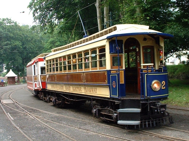 Car No.2 and Trailer No.56 working a private hire for the Isle of Man 50 Group pause at Laxey on the 1st of August 2002. © David Mee