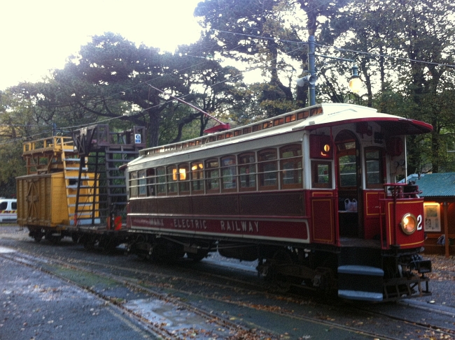 Car No.2 pauses in Laxey Station with Tower Wagons No.1 and No.12 for photographs on the 2nd of November 2013, as part of the Winter Photography event. © Alex Fairlie