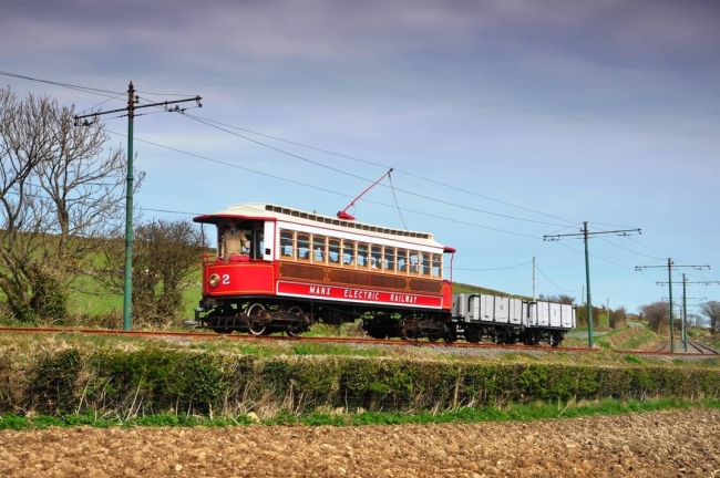 Car No.2 with Open Wagons No.8 and No.10 in tow pauses north of the Ballaskeig stop whilst working a private photographic charter on the 19th of April 2015. © Andrew Scarffe