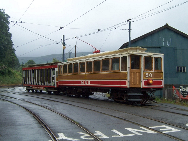 Car No.20 and Trailer No.40 pass Laxey Goods Shed with the 10:10 Ramsey to Derby Castle on a wet 18th of July 2011, with nearly all shutters down on No.40. © David Martin