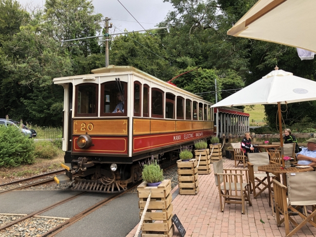 Car No.20 and Trailer No.43 arrive into Dhoon Glen with the 11:10 Ramsey to Derby Castle on the 1st of August 2021. © Alex Fairlie