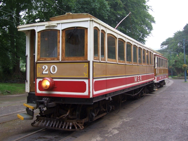 Car No.20 and Trailer No.58 stand at Laxey Station while working the 16:10 Ramsey to Derby Castle on the 24th of July 2012. © Alex Fairlie