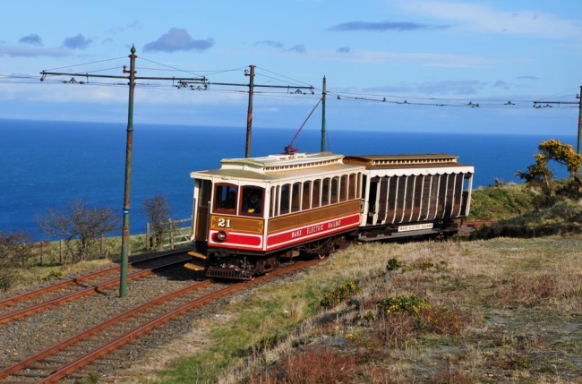 Blue skies and sea as Car No.21 and Trailer No.48 round the curve at Bulgham, working the 16:10 Derby Castle-Ramsey on the 29th of March 2015. © Andrew Scarffe