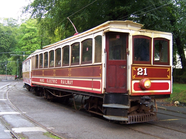 Car No.21 and Trailer No.58 wait to depart Laxey with the 10:10 for Ramsey on the 18th of July 2011, a rather wet day! © David Martin
