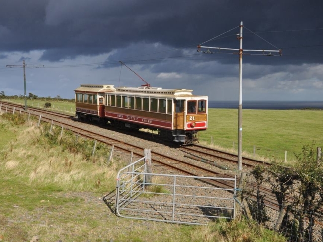 Under somewhat threatening skies, Car No.21 and Trailer No.59 descend from Ballaragh to Ballamoar working the 14:40 from Ramsey on the 18th of September 2013. © Andrew Scarffe